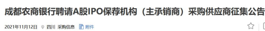 •   近日,据采招网消息,成都农商行发布聘请A股IPO保荐机构(主承销商)采购项目供应商征集公告。