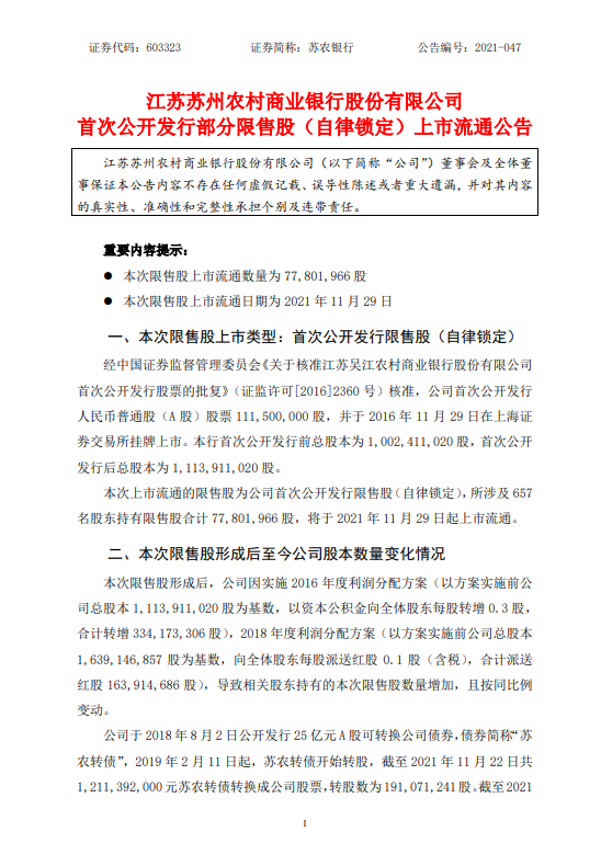 •   11月23日消息,苏农银行发布公告,本次限售股上市流通数量为7780.2万股,本次限售股上市流通日期为2021年11月29日。