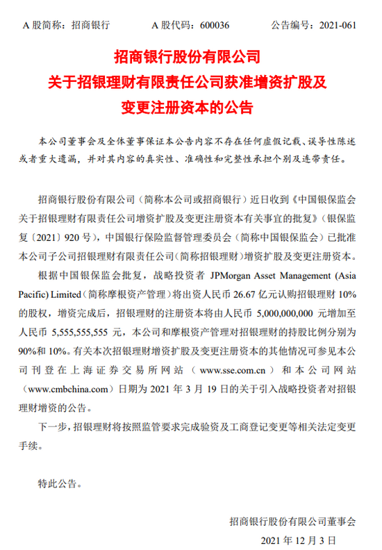 招商银行:银保监会批复公司筹建招银理财有限责任公司