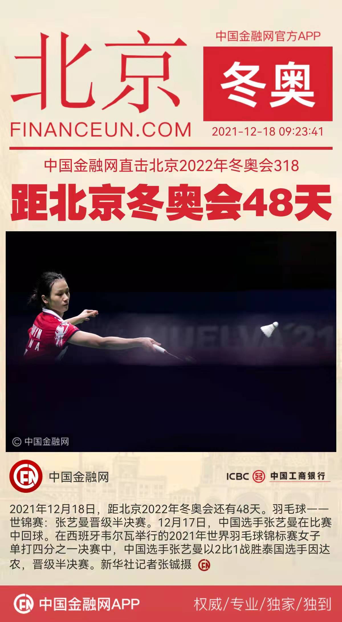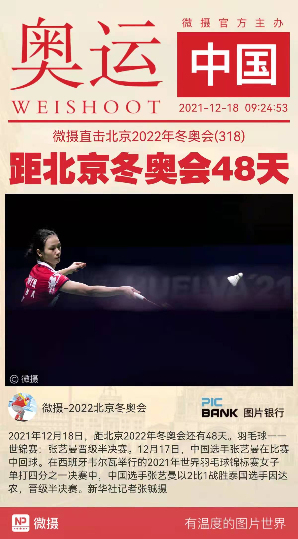 2021年12月18日,距北京2022年冬奥会还有48天。羽毛球——世锦赛:张艺曼晋级半决赛。12月17日,中国选手张艺曼在比赛中回球。在西班牙韦尔瓦举行的2021年世界羽毛球锦标赛女子单打四分之一决赛中,中国选手张艺曼以2比1战胜泰国选手因达农,晋级半决赛。