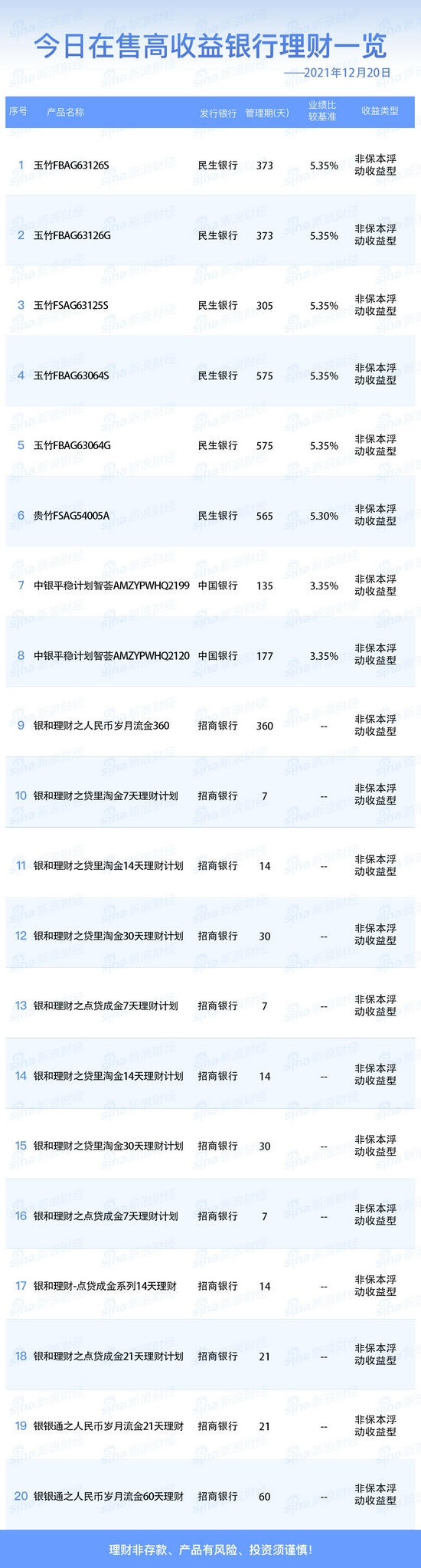 银行20日在售高收益理财产品一览
