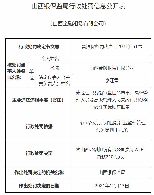 山西金融租赁违法被罚210万 未经资格审查任命高管等