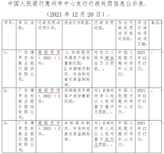 •   中国经济网北京1月12日讯 中国人民银行广州分行网站近日公布了惠州市中心支行行政处罚信息公示表,惠银罚字﹝2021﹞1号、2号、3号显示,广东博罗农村商业银行股份有限公司未按规定开展客户身份重新识别;未按规定制定、评估和完善交易监测标准。中国人民银行惠州市中心支行对该行处以人民币肆拾伍万元罚款。