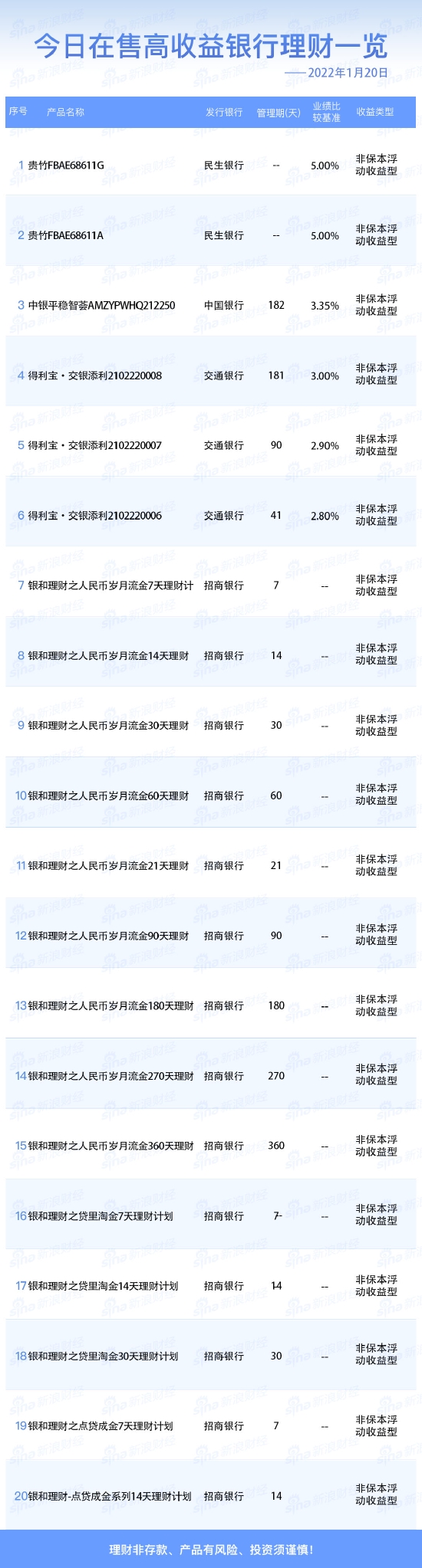 •   新浪财经1月20日在售高收益银行理财产品一览:今日业绩比较基准在2.80%及以上的银行人民币理财产品共6款。理财非存款、产品有风险、投资须谨慎!