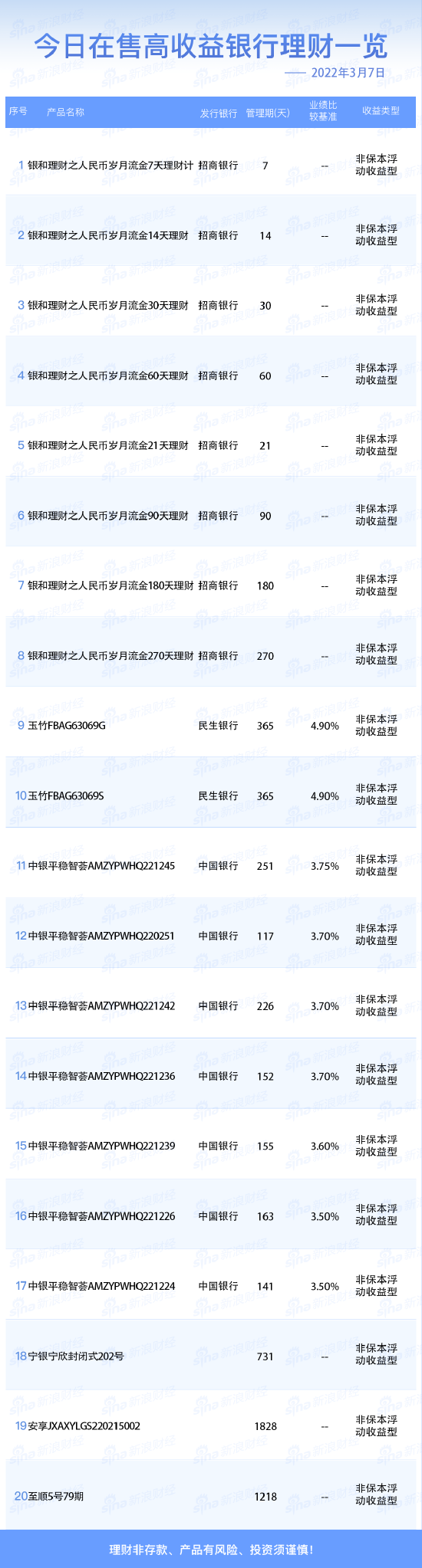 •   新浪财经3月7日在售高收益银行理财产品一览。今日业绩比较基准在3.00%及以上的银行人民币理财产品共9款。理财非存款、产品有风险、投资须谨慎!