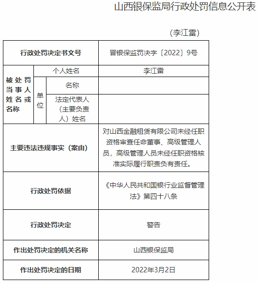 山西金融租赁违法被罚210万 未经资格审查任命高管等
