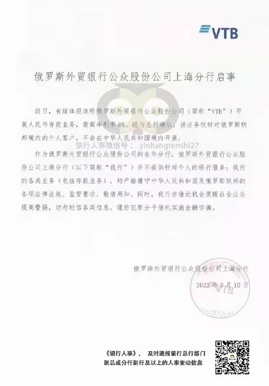 •   3月10日消息,针对媒体报道的“俄罗斯对外经贸银行自3月9日起开展人民币存款业务,最高年利率为8%。”这一消息,俄外贸银行上海分行做出回应。俄罗斯外贸银行上海分行称,该业务仅针对俄罗斯联邦境内的个人客户,不会在中国境内开展。