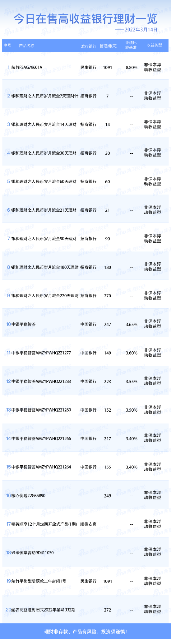 •   新浪财经3月14日在售高收益银行理财产品一览。今日业绩比较基准在3.00%及以上的银行人民币理财产品共7款。理财非存款、产品有风险、投资须谨慎!