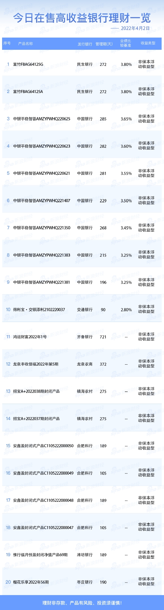 •   新浪财经4月2日在售高收益银行理财产品一览。今日业绩比较基准在2.80%及以上的银行人民币理财产品共10款。理财非存款、产品有风险、投资须谨慎!