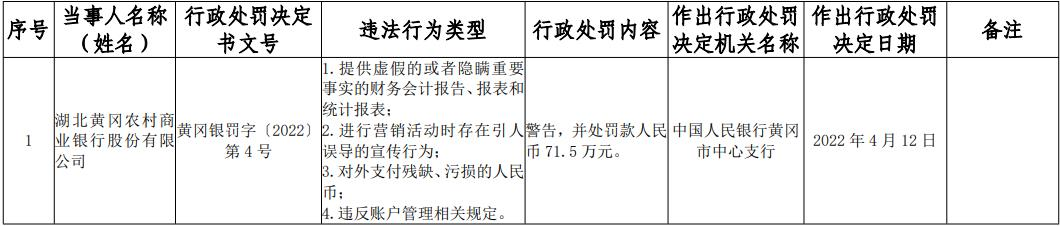 •   中国经济网北京4月20日讯 中国人民银行武汉分行网站昨日公布的中国人民银行黄冈市中心支行行政处罚信息公示表(黄冈银罚字〔2022〕4号)显示,湖北黄冈农村商业银行股份有限公司存在以下违法行为:1.提供虚假的或者隐瞒重要事实的财务会计报告、报表和统计报表;2.进行营销活动时存在引人误导的宣传行为;3.对外支付残缺、污损的人民币;4.违反账户管理相关规定。中国人民银行黄冈市中心支行于2022年4月12日决定对其警告,并处罚款人民币71.5万元。