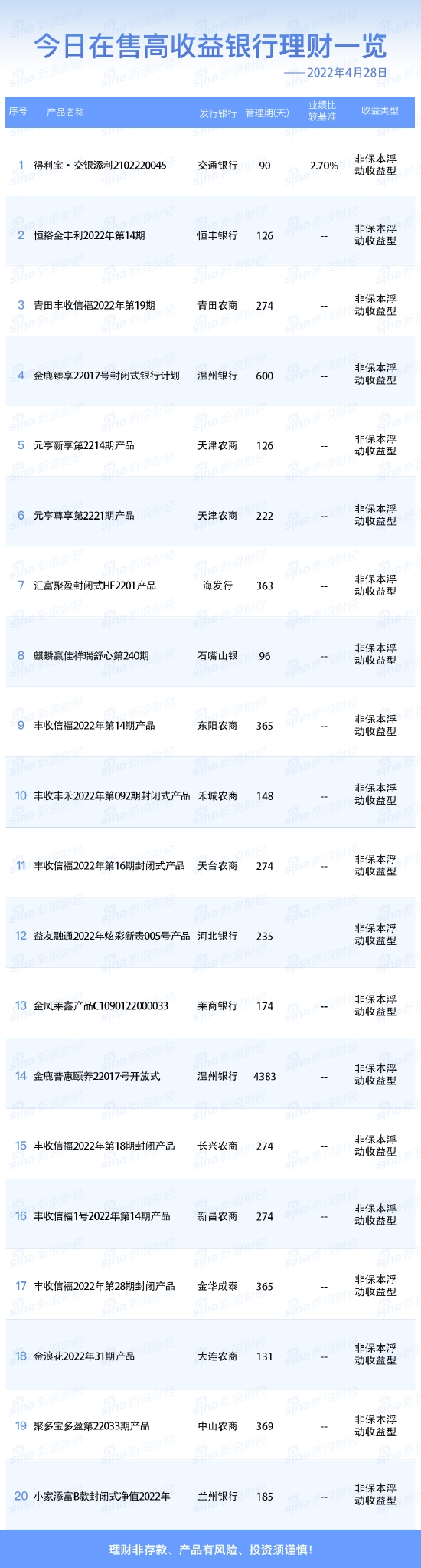 •   新浪财经4月28日在售高收益银行理财产品一览。今日业绩比较基准在2.70%及以上的银行人民币理财产品共1款。理财非存款、产品有风险、投资须谨慎!