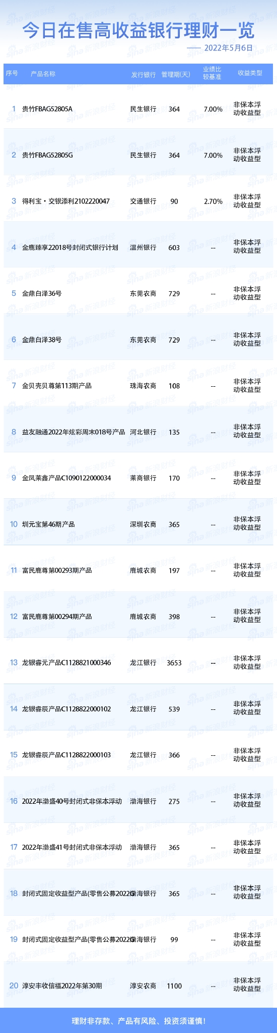 •   新浪财经5月6日在售高收益银行理财产品一览。今日业绩比较基准在2.70%及以上的银行人民币理财产品共3款。理财非存款、产品有风险、投资须谨慎!