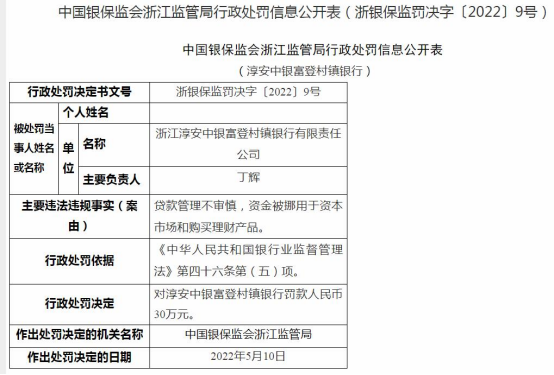 •   中国经济网北京5月12日讯 中国银保监会网站今日公布的中国银保监会浙江监管局行政处罚信息公开表(浙银保监罚决字〔2022〕9号)显示,浙江淳安中银富登村镇银行有限责任公司贷款管理不审慎,资金被挪用于资本市场和购买理财产品。中国银保监会浙江监管局依据《中华人民共和国银行业监督管理法》第四十六条第(五)项,对淳安中银富登村镇银行罚款人民币30万元。