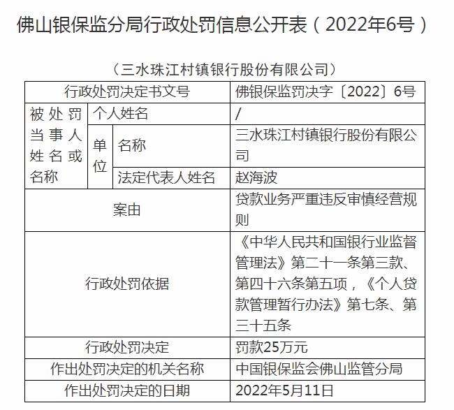 中国经济网北京5月17日讯 中国银保监会网站昨日发布的佛山银保监分局行政处罚信息公开表(2022年6号)显示,三水珠江村镇银行股份有限公司贷款业务严重违反审慎经营规则。中国银保监会佛山监管分局依据《中华人民共和国银行业监督管理法》第二十一条第三款、第四十六条第五项,《个人贷款管理暂行办法》第七条、第三十五条,对其罚款25万元。