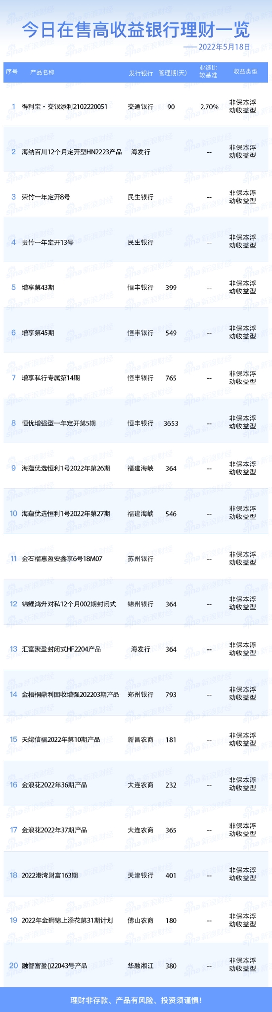 •   新浪财经5月18日在售高收益银行理财产品一览。今日业绩比较基准在2.70%及以上的银行人民币理财产品共1款。理财非存款、产品有风险、投资须谨慎!