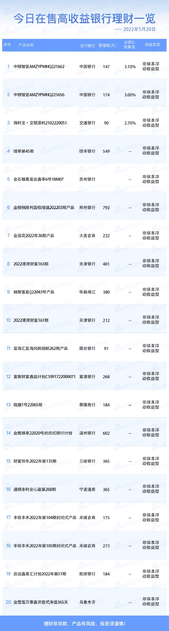 •   新浪财经5月20日在售高收益银行理财产品一览。今日业绩比较基准在2.70%及以上的银行人民币理财产品共3款。理财非存款、产品有风险、投资须谨慎!