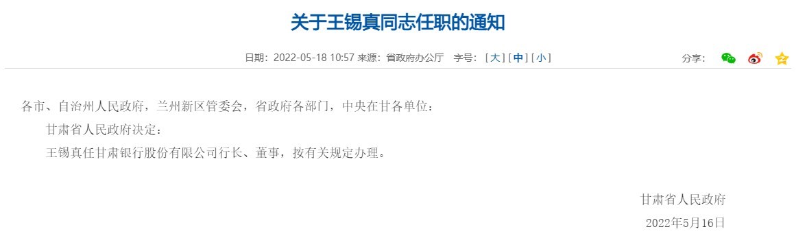 甘肃银行行长王锡真拟任省管企业党委书记、董事长