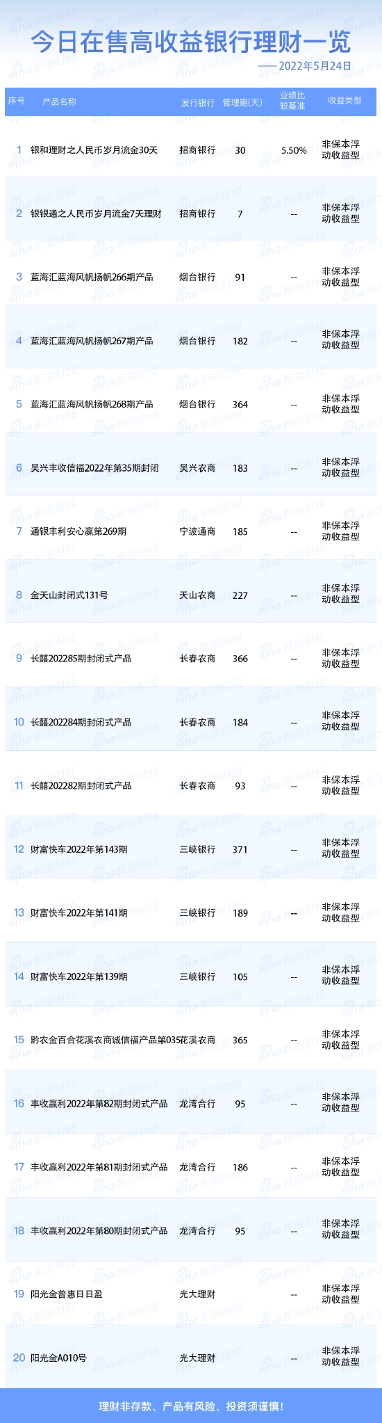 •   新浪财经5月24日在售高收益银行理财产品一览。今日业绩比较基准在5.50%及以上的银行人民币理财产品共1款。理财非存款、产品有风险、投资须谨慎!