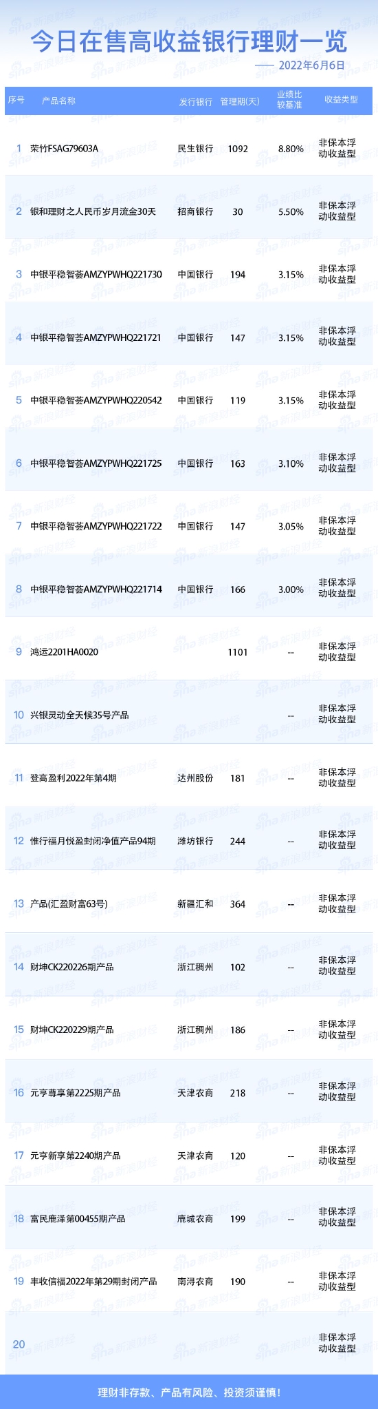 •   新浪财经6月6日在售高收益银行理财产品一览。今日业绩比较基准在3.00%及以上的银行人民币理财产品共8款。理财非存款、产品有风险、投资须谨慎!