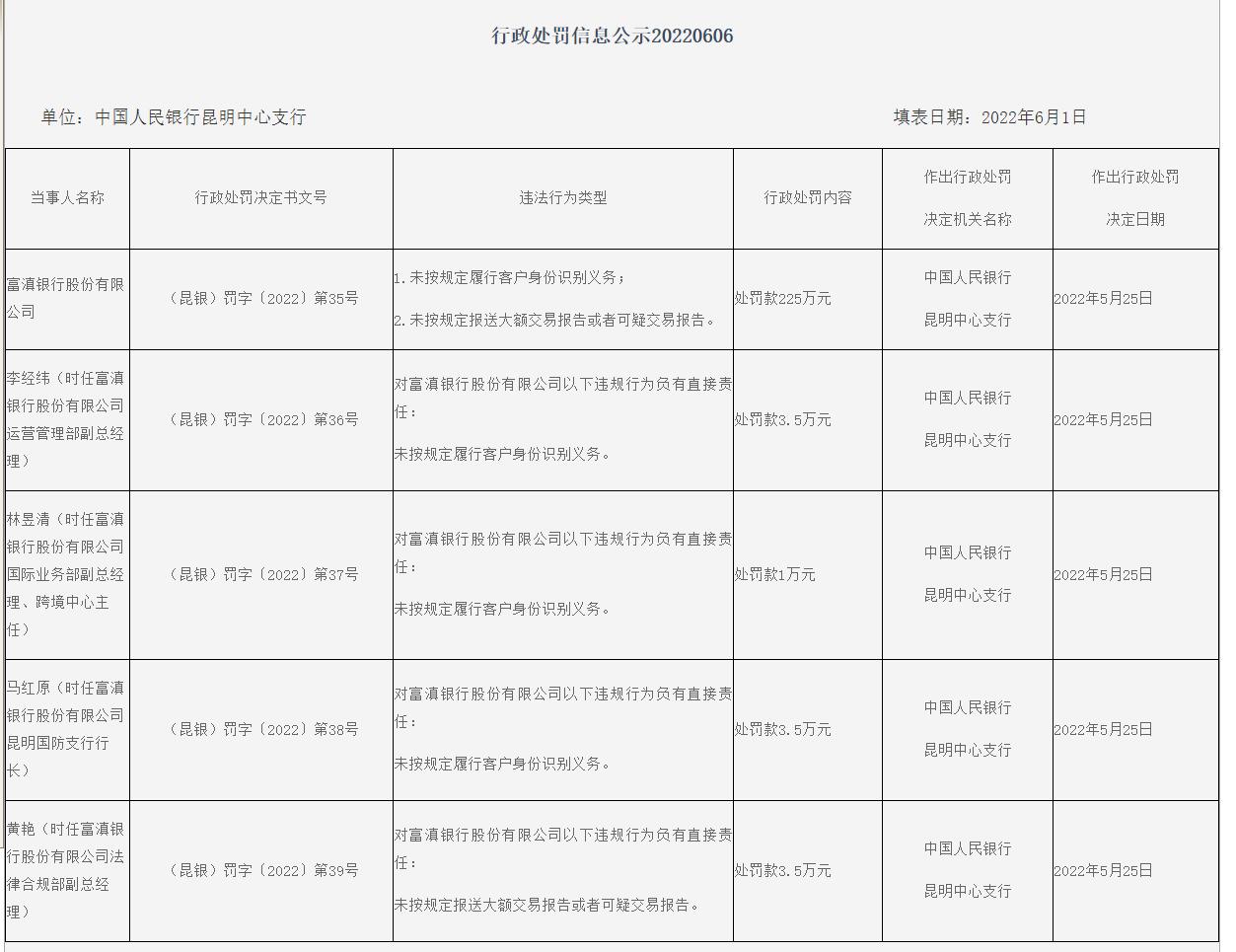 同日公布的(昆银)罚字〔2022〕第36号显示,李经纬(时任富滇银行股份有限公司运营管理部副总经理)对富滇银行股份有限公司以下违规行为负有直接责任:未按规定履行客户身份识别义务。中国人民银行昆明中心支行对李经纬处罚款3.5万元。