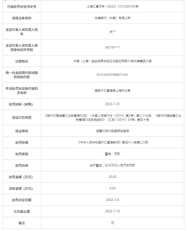 中国经济网北京7月13日讯 外汇局网站近日公布的行政处罚决定书(上海汇管罚字〔2022〕3121220102号)显示,花旗银行(中国)有限公司(简称“花旗中国”)存在“结售汇统计数据报送错误”的违法事实。国家外汇管理局上海市分局依据《中华人民共和国外汇管理条例》第四十八条第(二)项,给予花旗中国警告、处30万元人民币的罚款。