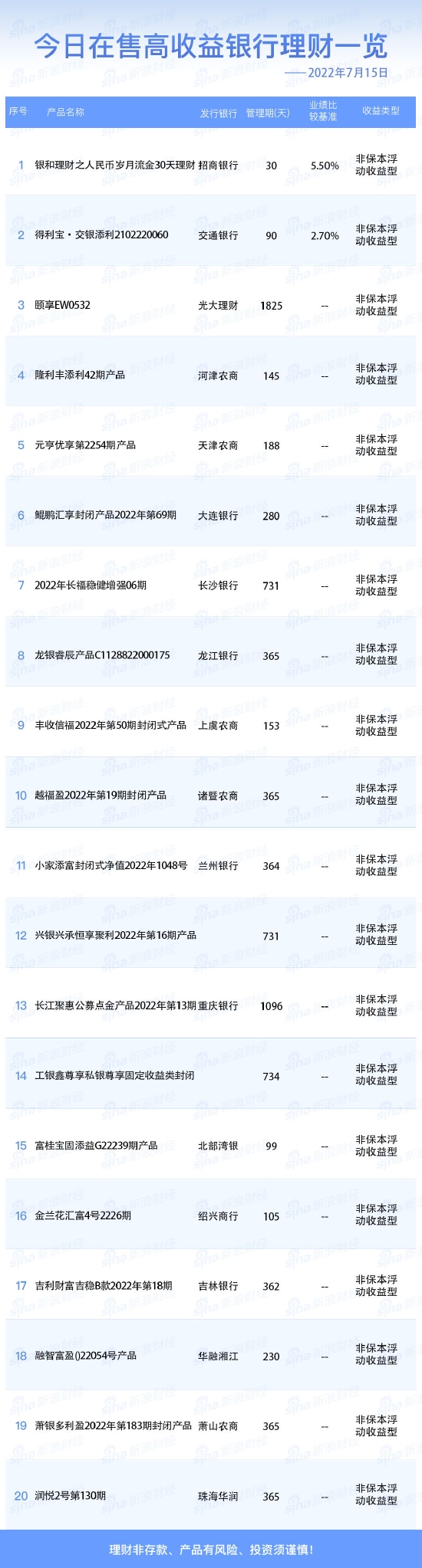 •   新浪财经7月15日在售高收益银行理财产品一览。今日业绩比较基准在2.70%及以上的银行人民币理财产品共2款。理财非存款、产品有风险、投资须谨慎!