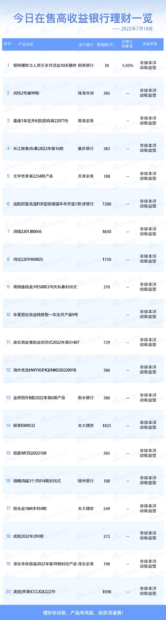 •   新浪财经7月18日在售高收益银行理财产品一览。今日业绩比较基准在5.50%及以上的银行人民币理财产品共1款。理财非存款、产品有风险、投资须谨慎!