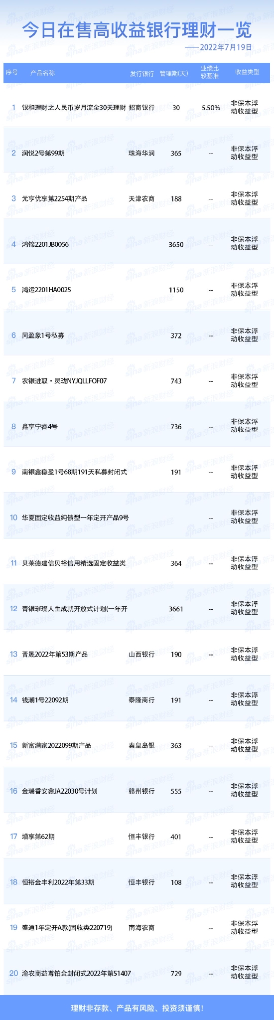 •   新浪财经7月19日在售高收益银行理财产品一览。今日业绩比较基准在5.50%及以上的银行人民币理财产品共1款。理财非存款、产品有风险、投资须谨慎!