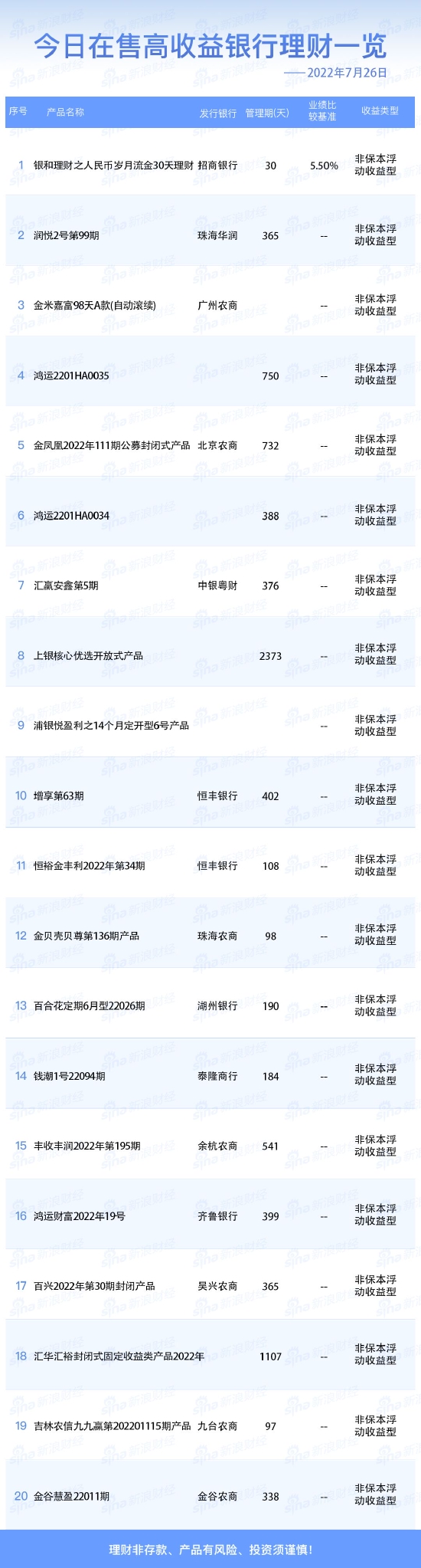 •   新浪财经7月26日在售高收益银行理财产品一览。今日业绩比较基准在5.50%及以上的银行人民币理财产品共1款。理财非存款、产品有风险、投资须谨慎!