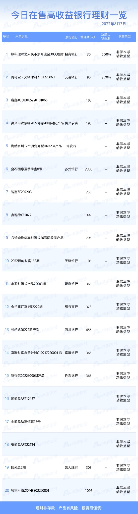 •   新浪财经8月3日在售高收益银行理财产品一览。今日业绩比较基准在2.70%及以上的银行人民币理财产品共2款。理财非存款、产品有风险、投资须谨慎!