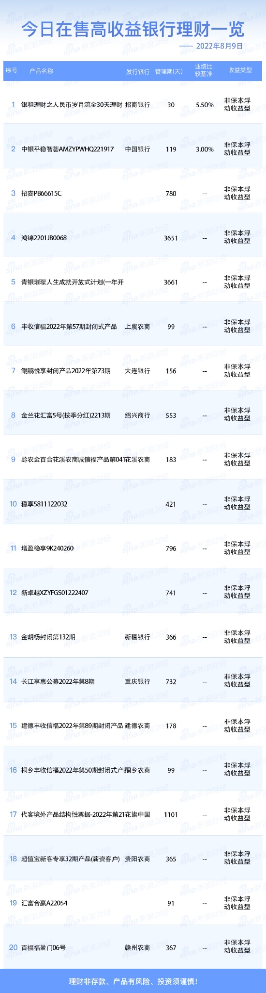 •   新浪财经8月9日在售高收益银行理财产品一览。今日业绩比较基准在3.00%及以上的银行人民币理财产品共2款。理财非存款、产品有风险、投资须谨慎!