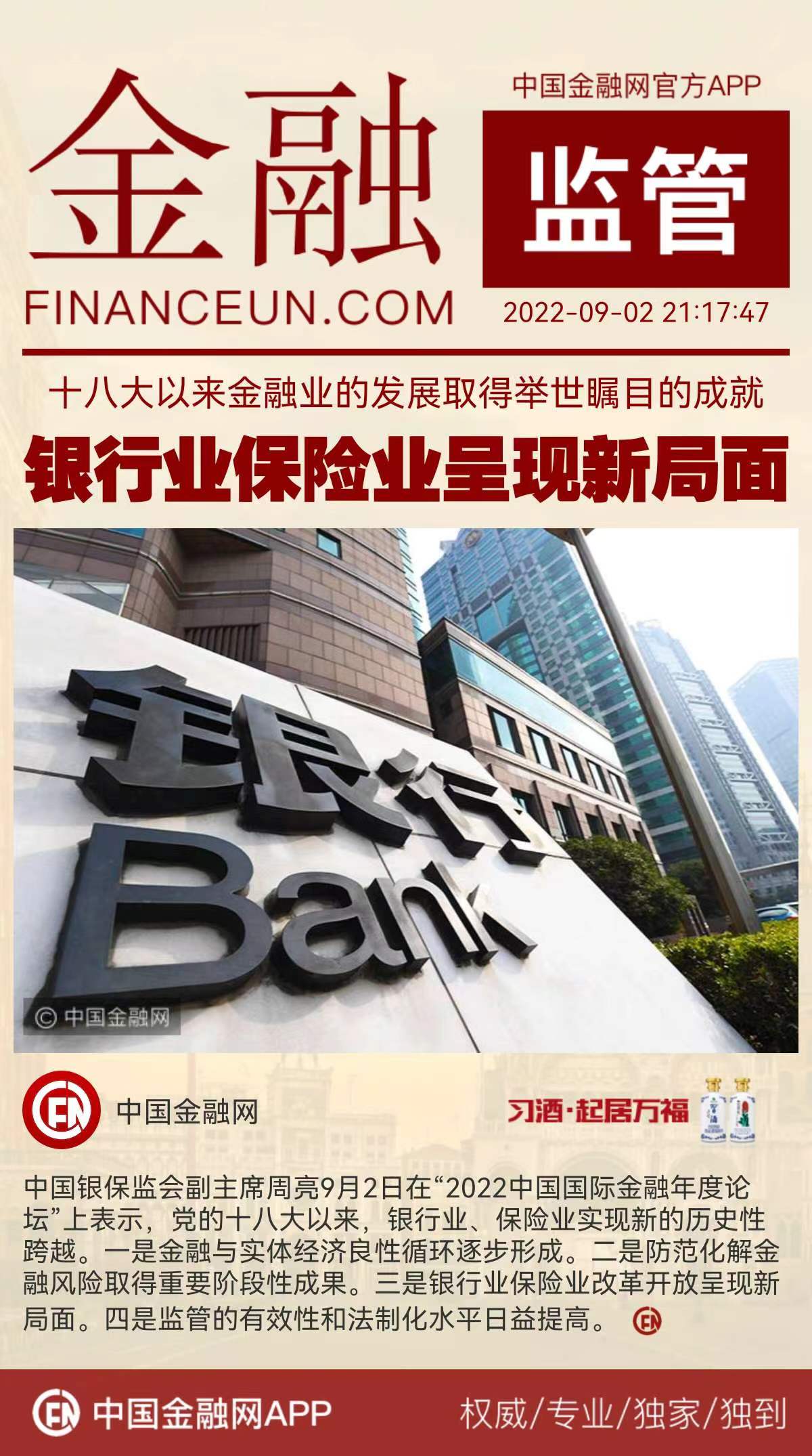 中国银保监会副主席周亮9月2日在“2022中国国际金融年度论坛”上表示,党的十八大以来,银行业、保险业实现新的历史性跨越。一是金融与实体经济良性循环逐步形成。二是防范化解金融风险取得重要阶段性成果。三是银行业保险业改革开放呈现新局面。四是监管的有效性和法制化水平日益提高。