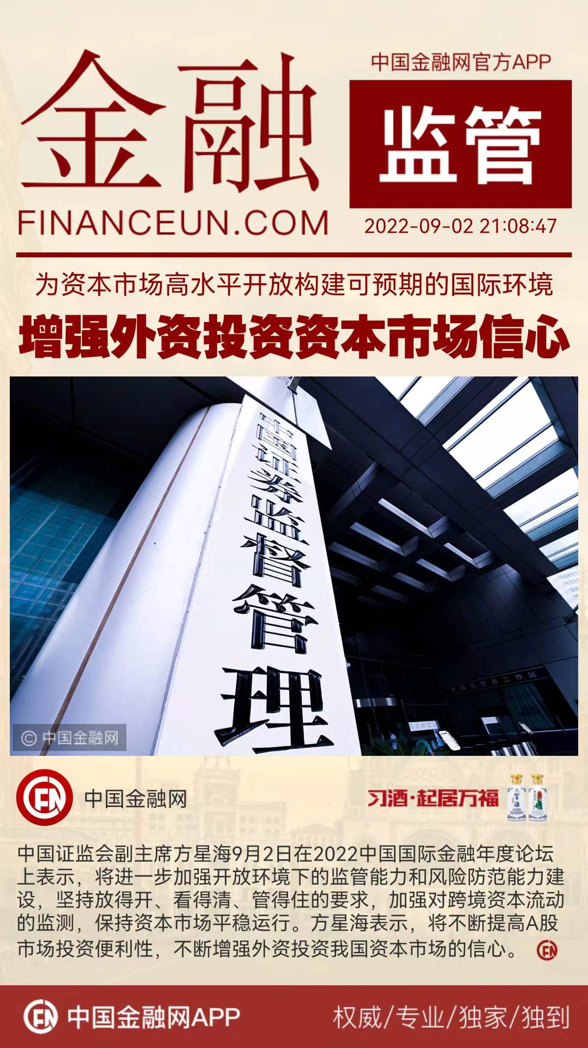 中国证监会副主席方星海9月2日在2022中国国际金融年度论坛上表示,将进一步加强开放环境下的监管能力和风险防范能力建设,坚持放得开、看得清、管得住的要求,加强对跨境资本流动的监测,保持资本市场平稳运行。方星海表示,将不断提高A股市场投资便利性,不断增强外资投资我国资本市场的信心。
