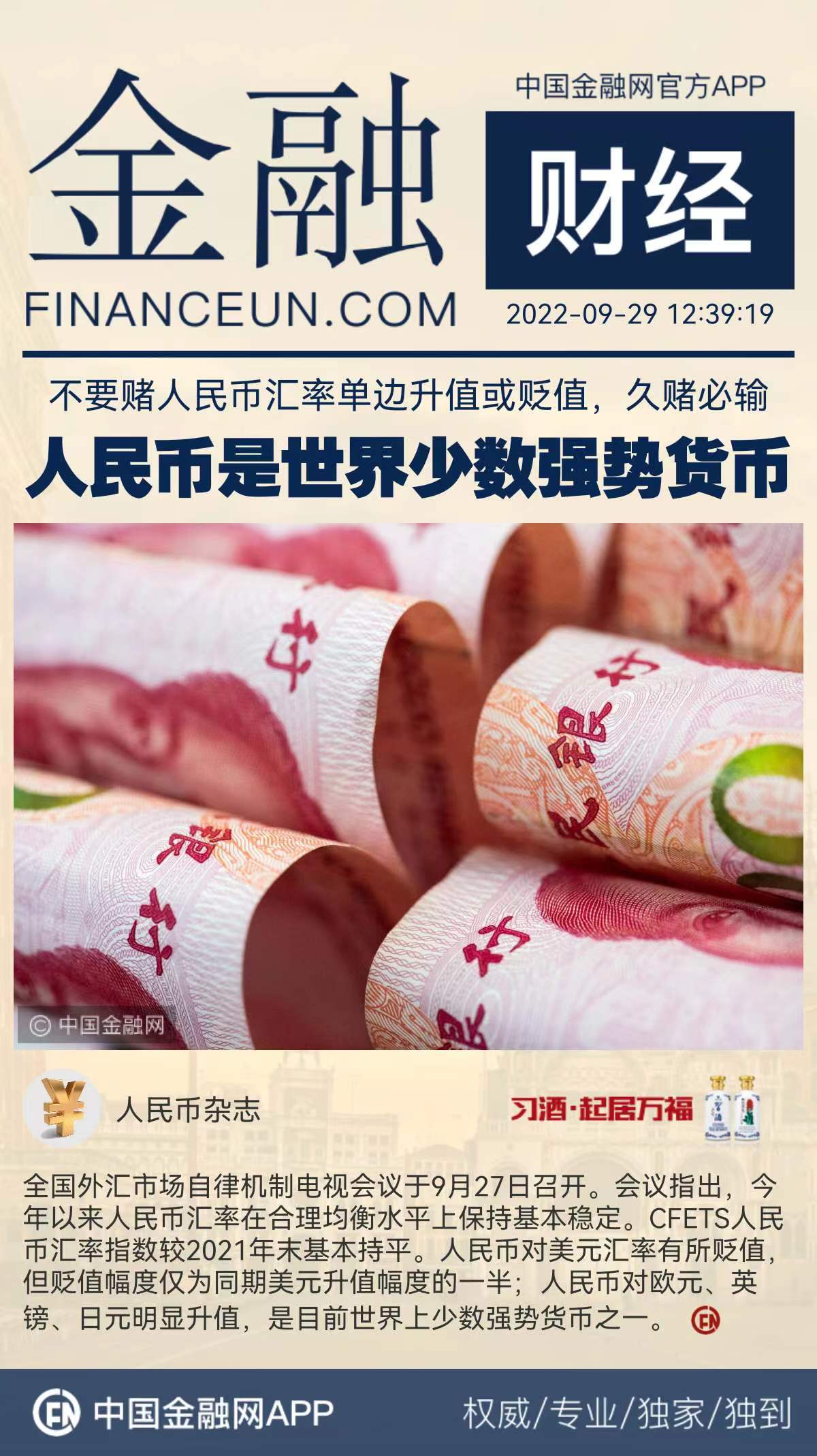 全国外汇市场自律机制电视会议于9月27日召开。会议指出,今年以来人民币汇率在合理均衡水平上保持基本稳定。CFETS人民币汇率指数较2021年末基本持平。人民币对美元汇率有所贬值,但贬值幅度仅为同期美元升值幅度的一半;人民币对欧元、英镑、日元明显升值,是目前世界上少数强势货币之一。