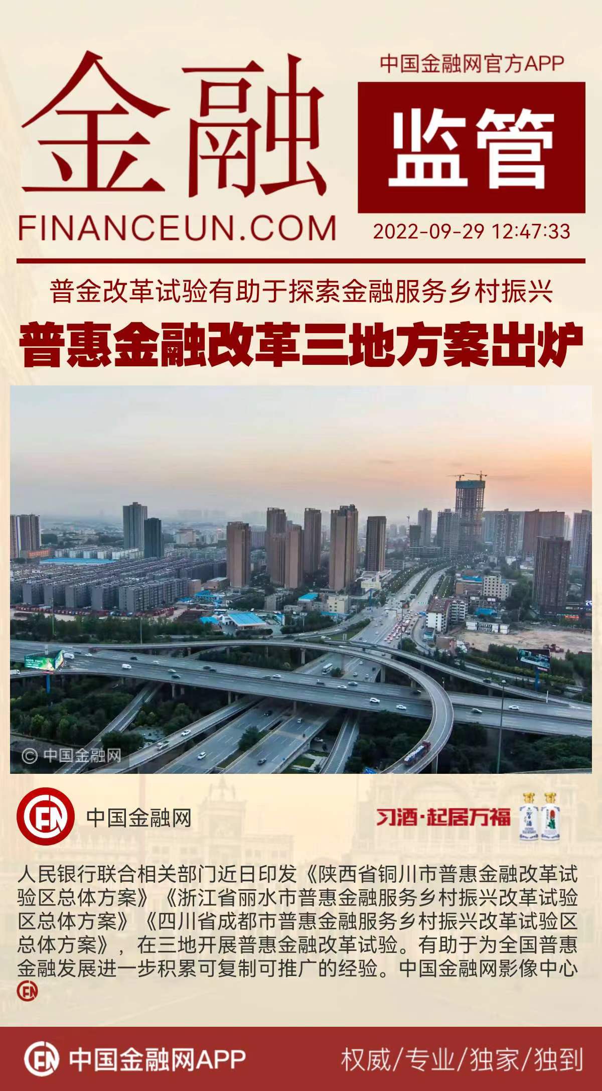 人民银行联合相关部门近日印发《陕西省铜川市普惠金融改革试验区总体方案》《浙江省丽水市普惠金融服务乡村振兴改革试验区总体方案》《四川省成都市普惠金融服务乡村振兴改革试验区总体方案》,在三地开展普惠金融改革试验。有助于为全国普惠金融发展进一步积累可复制可推广的经验。