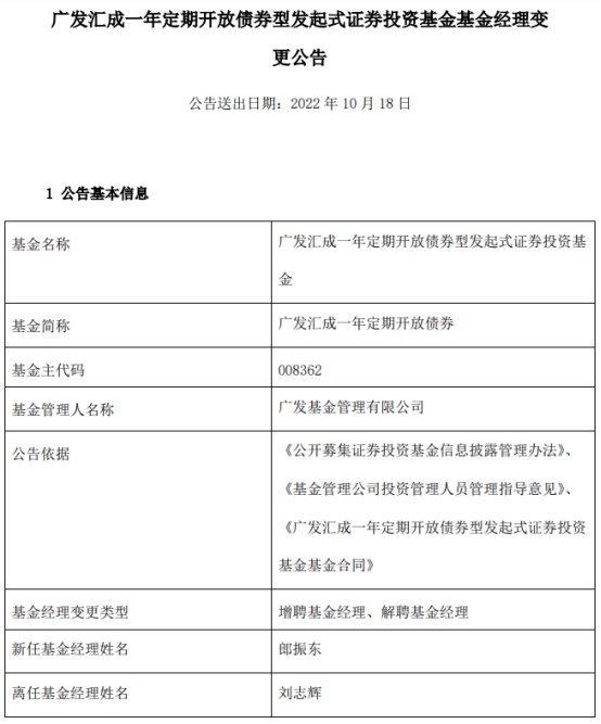广发汇成一年定开债券增聘基金经理郎振东 刘志辉离任