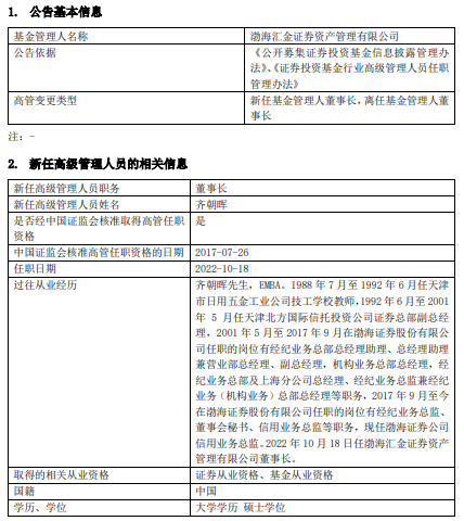 资料显示,齐朝晖1988年7月至1992年6月任天津市日用五金工业公司技工学校教师,1992年6月至2001年5月任天津北方国际信托投资公司证券总部副总经理,2001年5月至2017年9月在渤海证券股份有限公司任职的岗位有经纪业务总部总经理助理、总经理助理兼营业部总经理、副总经理,机构业务总部总经理,经纪业务总部及上海分公司总经理、经纪业务总监兼经纪业务(机构业务)总部总经理等职务,2017年9月至今在渤海证券股份有限公司任职的岗位有经纪业务总监、董事会秘书、信用业务总监等职务,现任渤海证券公司信用业务总监。2022年10月18日任渤海汇金证券资产管理有限公司董事长。