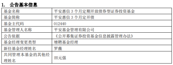 平安惠信3个月定开债增聘基金经理罗薇