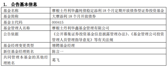 大摩添利18个月开放债券增聘基金经理陈言一