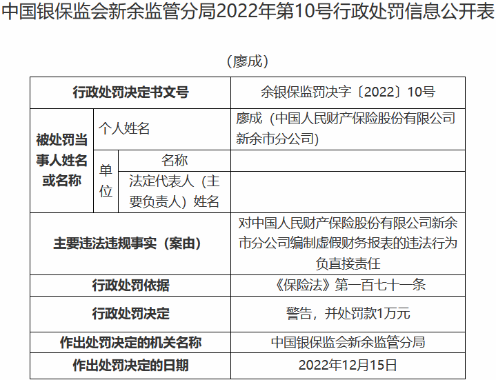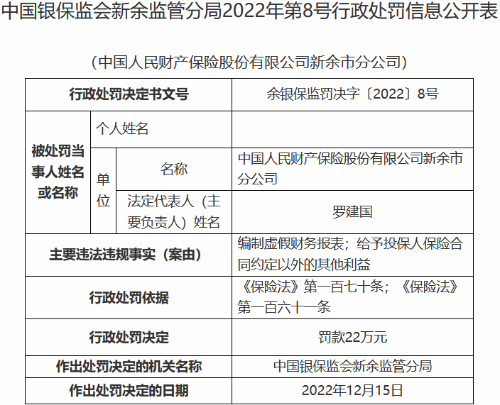 •   中国经济网北京12月21日讯 中国银保监会网站昨日公布的新余监管分局行政处罚信息公开表(余银保监罚决字〔2022〕8号-12号)显示,中国人民财产保险股份有限公司新余市分公司存在两宗违法违规行为,一是编制虚假财务报表,二是给予投保人保险合同约定以外的其他利益。