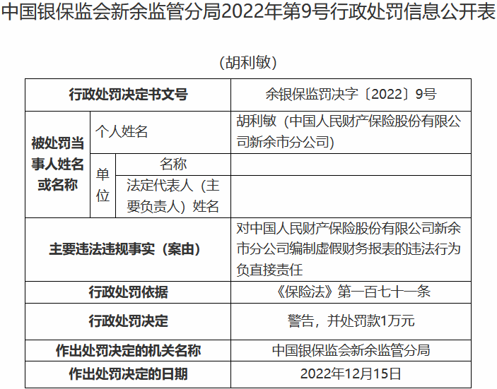 人保财险新余市分公司2宗违法被罚 编制虚假报表等