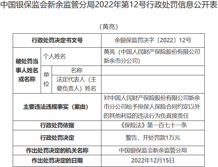 新余银保监分局依据《保险法》第一百六十一条、第一百七十条、第一百七十一条,对中国人民财产保险股份有限公司新余市分公司罚款22万元;对胡利敏警告,并处罚款1万元;对廖成警告,并处罚款1万元;对常波警告,并处罚款1万元;对黄亮警告,并处罚款1万元。