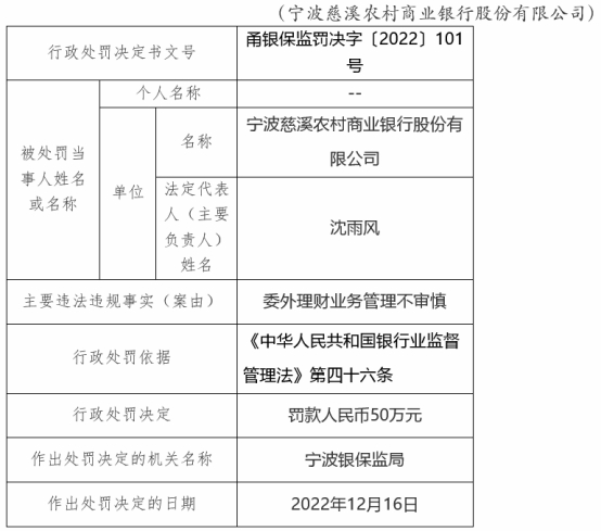 慈溪农村商业银行违法被罚 员工行为管理不到位