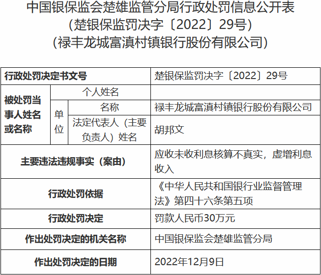 •   中国经济网北京12月28日讯 中国银保监会网站昨日公布的楚雄监管分局行政处罚信息公开表(楚银保监罚决字〔2022〕29号)显示,禄丰龙城富滇村镇银行股份有限公司应收未收利息核算不真实,虚增利息收入。