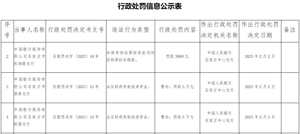 中国银行石家庄市三家支行违规被罚 占压财政存款等