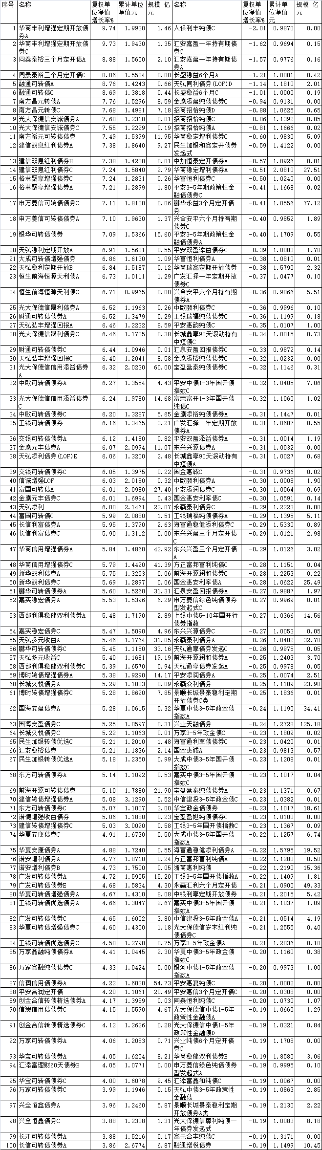此外,同泰泰裕三个月定开债A、同泰泰裕三个月定开债C、融通可转债A、融通可转债C涨幅也高达8.88%、8.86%、8.76%、8.69%。南方昌元转债A、南方昌元转债C、光大保德信安诚债券A、光大保德信安诚债券C、南方希元可转债债券等众多债基前2月涨幅都超过7%。