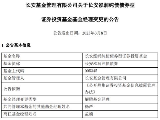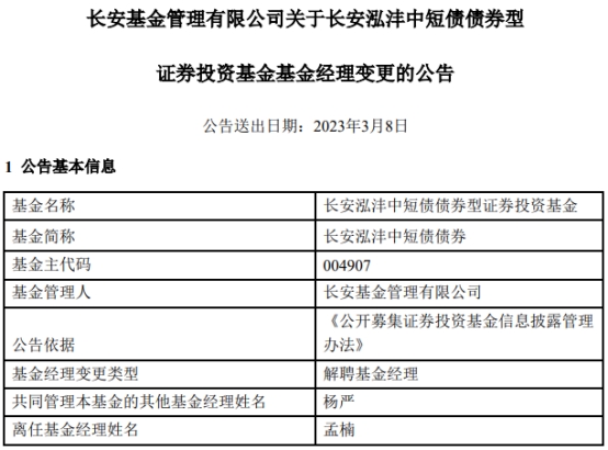 长安基金2只债券基金增聘基金经理杨严