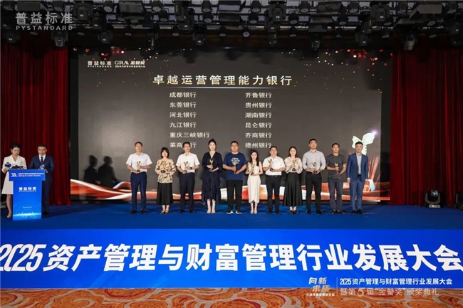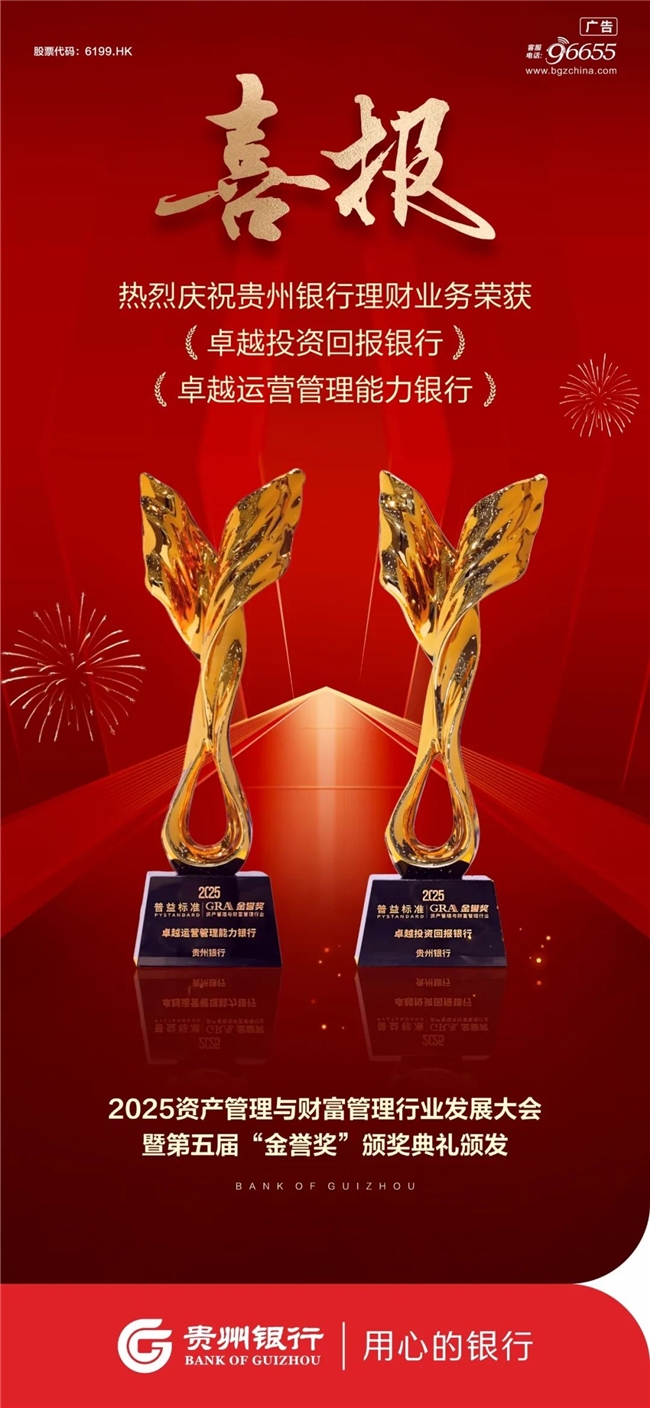 2025年6月13日,在普益标准主办的“2025资产管理与财富管理行业发展大会暨第五届‘金誉奖’颁奖典礼”上,贵州银行荣获“卓越投资回报银行”和“卓越运营管理能力银行”两项大奖。