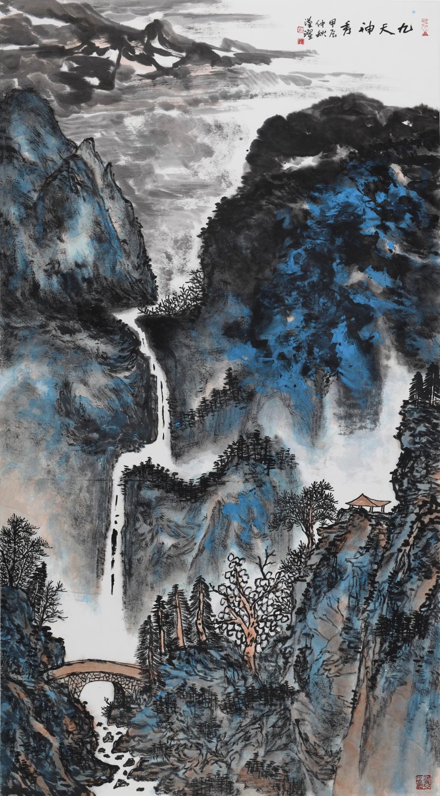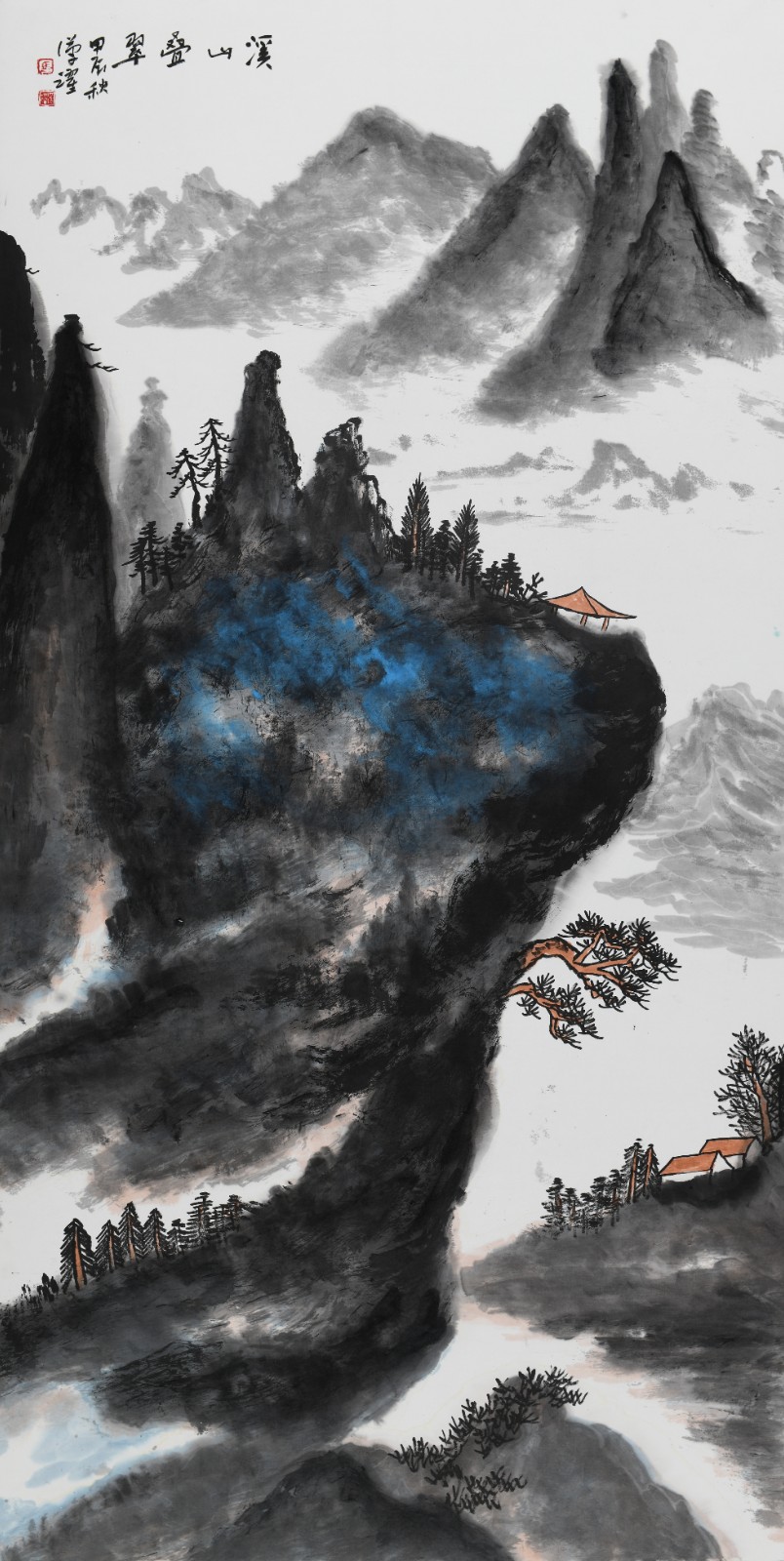 马汉跃的笔墨语言,是山水生命最直接的呈现。他深谙 "骨法用笔" 的古训,却不困于一家之法。笔下线条如老松蟠曲,既有北派山水的雄健刚猛,如《九鼎莲花》中陡峭山峦的勾勒,笔力扛鼎,似能听见石质崩裂的脆响;又融入南派山水的舒展空灵,《青山为邻翠连天》里的云霭用淡墨层层晕染,笔锋轻转处,云雾便有了流动的韵律,仿佛能嗅到湿润的草木气息。这种刚柔相济的笔墨,恰如生命体中的筋骨与血脉,互为支撑又彼此滋养。