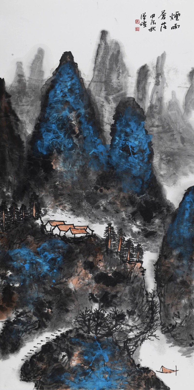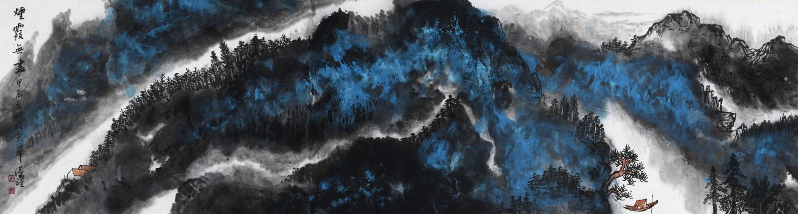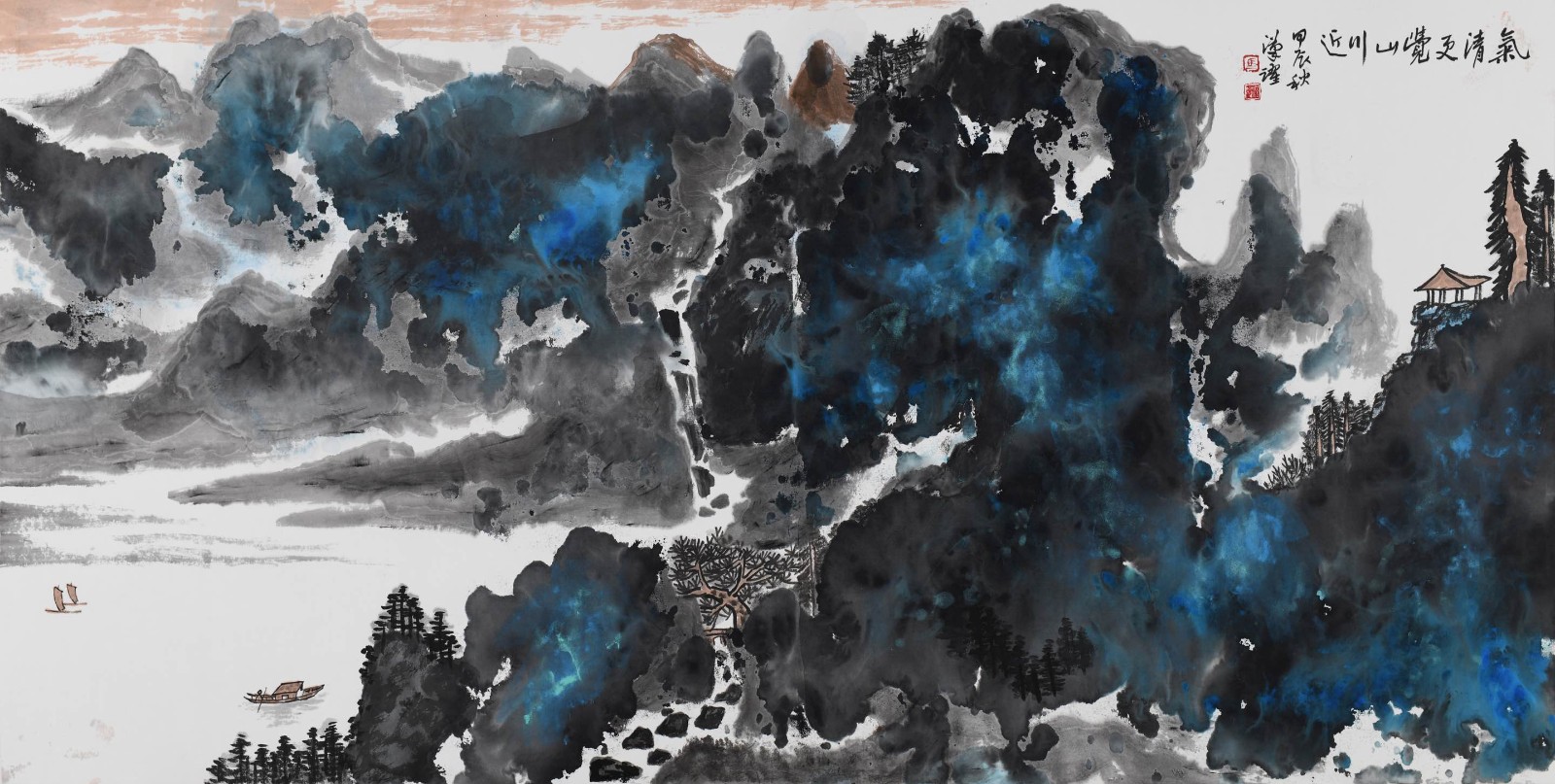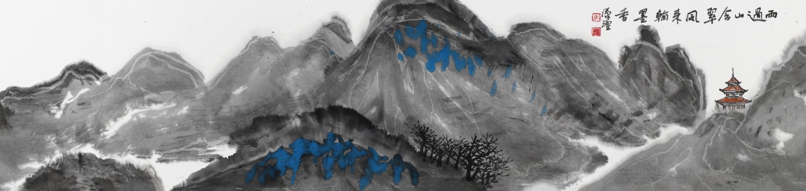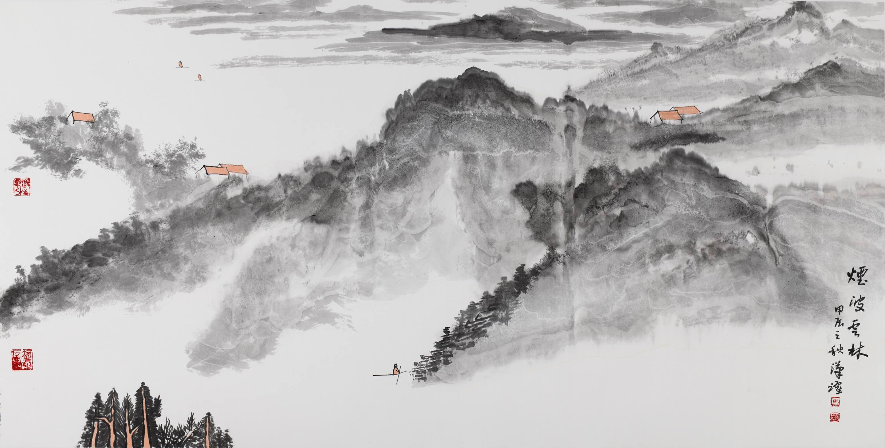 他将西方绘画的光影意识融入水墨,却不破坏东方美学的空灵。《青山为邻翠连天》中,远山受光处用淡赭石轻扫,背光处则以花青晕染,这种微妙的色彩变化,让山峦有了呼吸般的明暗节奏,却始终保持着 "计白当黑" 的东方意境。这种跨文化的艺术对话,不是简单的技法叠加,而是生命对不同养分的兼容并蓄 —— 正如天地从不拒绝任何一缕阳光,真正的艺术生命,亦能在多元碰撞中获得更丰沛的能量。
